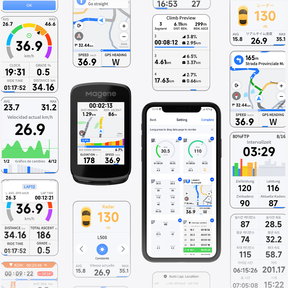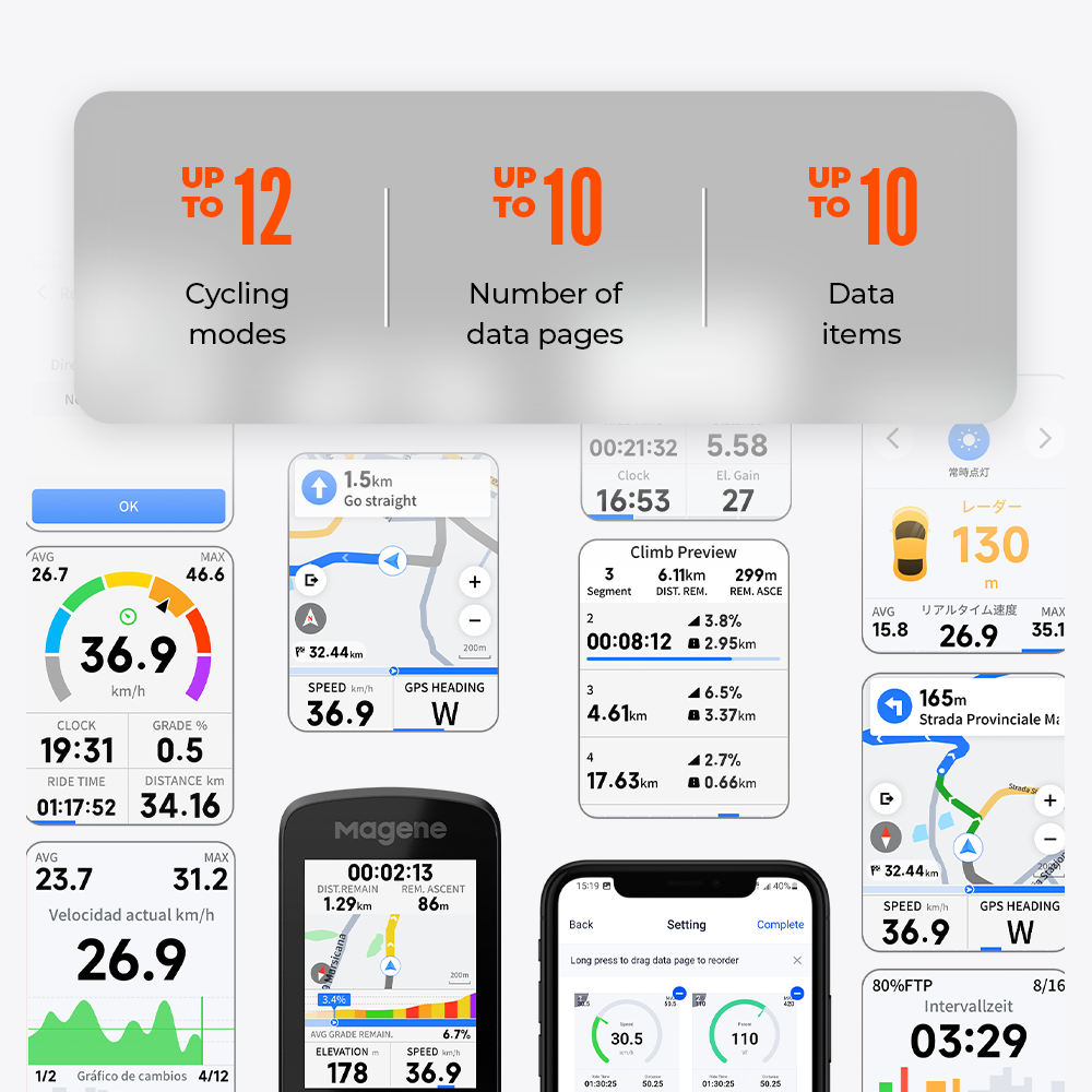Díky podpoře 12 cyklistických režimů s přizpůsobitelným rozvržením dat uspokojí různorodé potřeby jízdy. Ať už se jedná o poklidnou víkendovou jízdu nebo každodenní trénink, není třeba resetovat zobrazení dat.